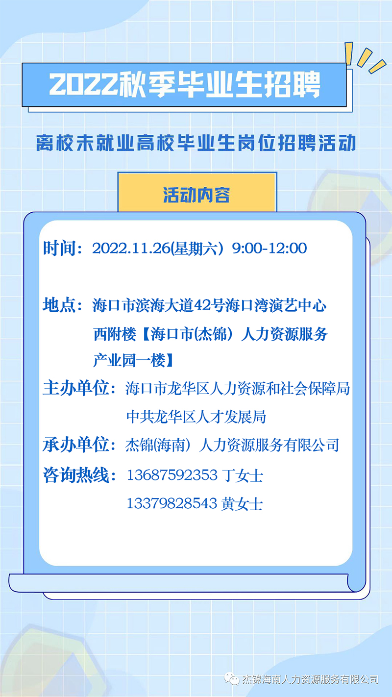 隨著疫情形勢(shì)逐步向好,市場(chǎng)環(huán)境、經(jīng)濟(jì)形勢(shì)迅速?gòu)?fù)蘇,企業(yè)單位用工需求增大。加之畢業(yè)季來臨,高校畢業(yè)生群體就業(yè)需求激增。為幫助用人單位更好的招納人才,讓廣大求職者找到理想的就業(yè)崗位,我司將在??谑旋埲A區(qū)人力資源和社會(huì)保障局、中共龍華區(qū)委人才發(fā)展局指導(dǎo)下積極搭建用人單位和求職者雙向選擇平臺(tái),將于11月26日舉辦招聘會(huì)活動(dòng)。