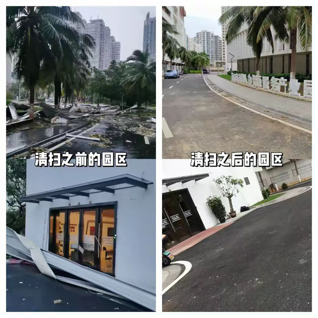 今年第11號超強(qiáng)臺風(fēng)“摩羯”對??谑性斐闪藝?yán)重影響,為盡快恢復(fù)園區(qū)正常運(yùn)營,保障園區(qū)各企業(yè)災(zāi)后復(fù)工復(fù)產(chǎn),園區(qū)總經(jīng)理劉昕暉對此高度重視,迅速組織園區(qū)工作人員有序開展臺風(fēng)過后清理恢復(fù)工作,消除安全隱患。