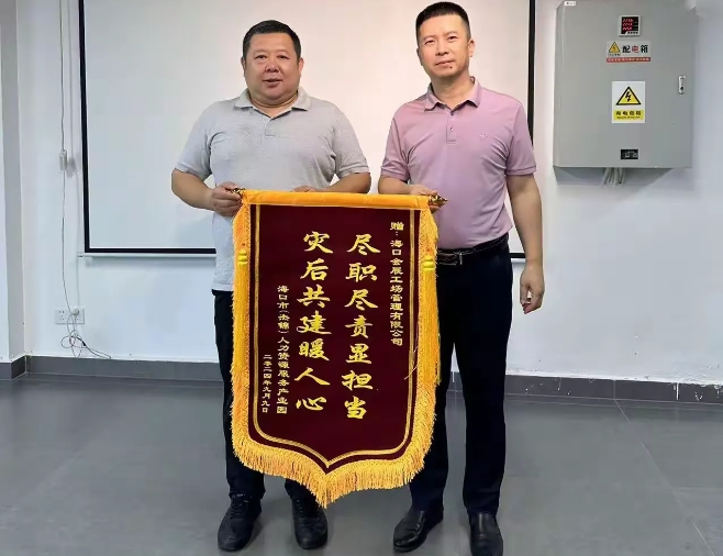 為感謝??跁构鲈趫@區(qū)臺風過后重修重建工作的積極配合和幫助,9月29日,海口市(杰錦)人力資源產(chǎn)業(yè)園總經(jīng)理劉昕暉特代表園區(qū)全體向??跁构鲑浰湾\旗。